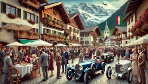 DALL·E 2024-07-07 04.39.25 – A realistic photograph of a lively gathering in a European Alps mountain village during a vintage car race event. T