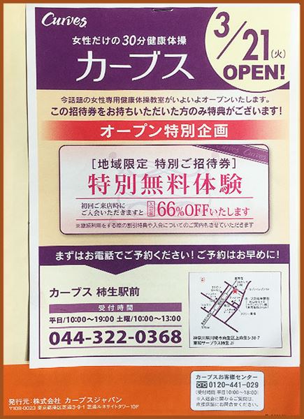 カーブスCurvesが3月21日(火}柿生駅前にオープンします。女性限定です。